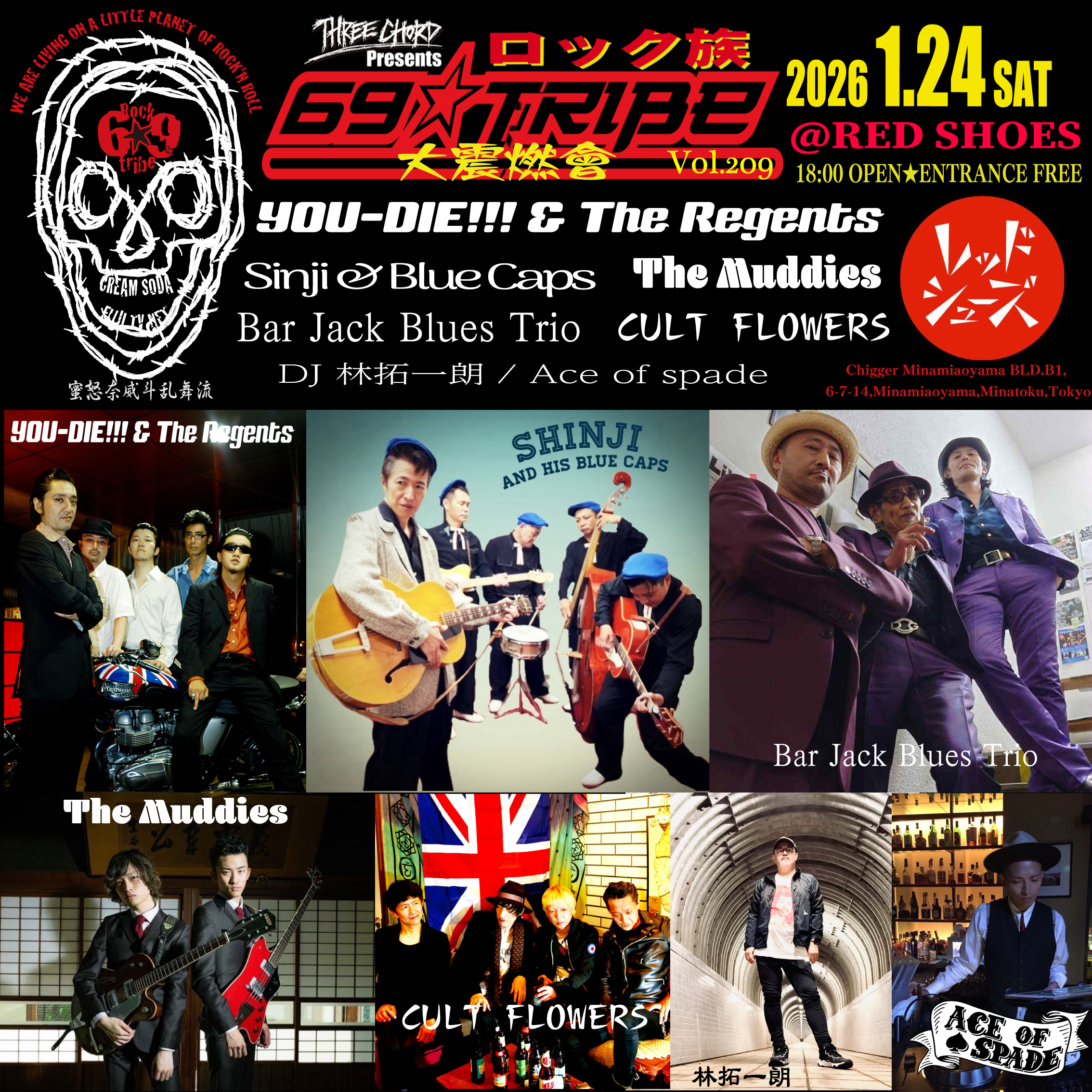 1/24 SAT @Red Shoes 18:00 OPEN Free entry <69★BANDS> YOU-DIE!!! & The Regents Bar Jack Blues Trio SHINJI & HIS BLUE CAPS カルトフラワーズ The Muddies <69★SELECTORS> 林拓一朗 DJ Ace of Spade Rock till you die!!! ロックにヨ★ロ★シ★ク!